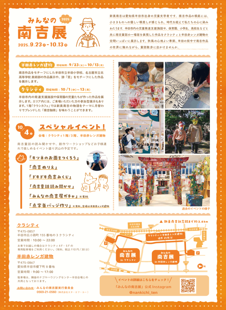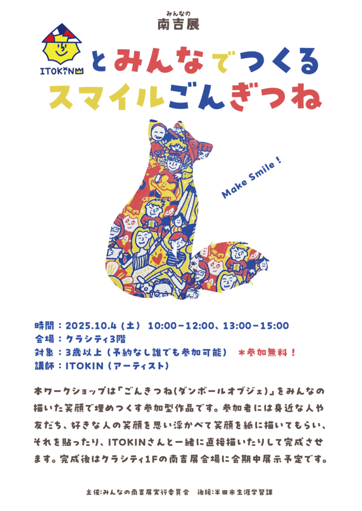 半田市で開催される「みんなの南吉展」のイベントとして、ITOKiNと一緒に参加型ワークショップ 『スマイルごんぎつね』 を行います。